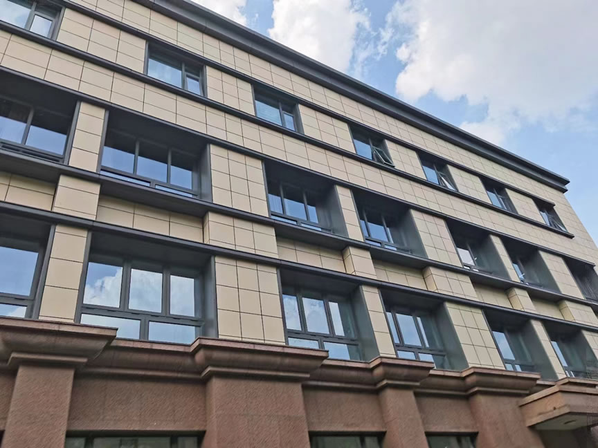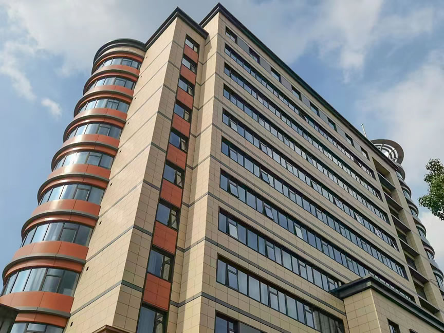 項目位于上海新村路,建筑面積近10萬平方米,為三級甲等綜合性醫(yī)院。 醫(yī)院外立面使用協(xié)進純色陶瓷薄板鋪貼。 產品色澤均勻細膩,效果整潔大氣。