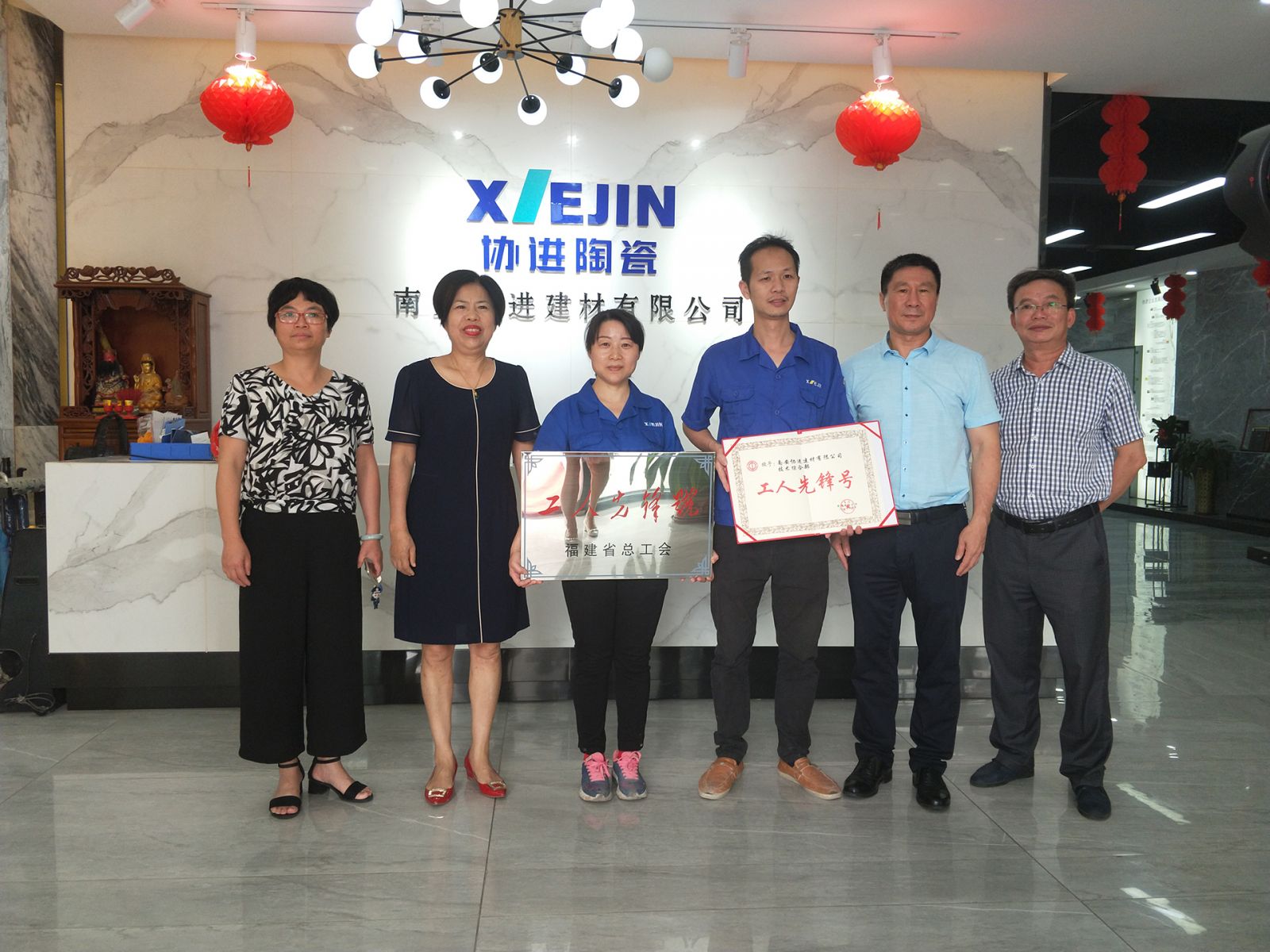 2019年5月16日下午,南安市總工會(huì)黨組書記常務(wù)副主席黃海鷹在鎮(zhèn)工會(huì)主席李彩芳的帶領(lǐng)下,特地來(lái)公司為技術(shù)綜合部頒發(fā)省級(jí)“工人先鋒號(hào)”匾牌。公司技術(shù)綜合部,瞄準(zhǔn)市場(chǎng)需求,攻克技術(shù)難題,銳意進(jìn)取,在外墻、內(nèi)墻、大板、薄板等瓷磚領(lǐng)域的技術(shù)上都有新的突破。被福建省總工會(huì)評(píng)為五一“工人先鋒號(hào)”。