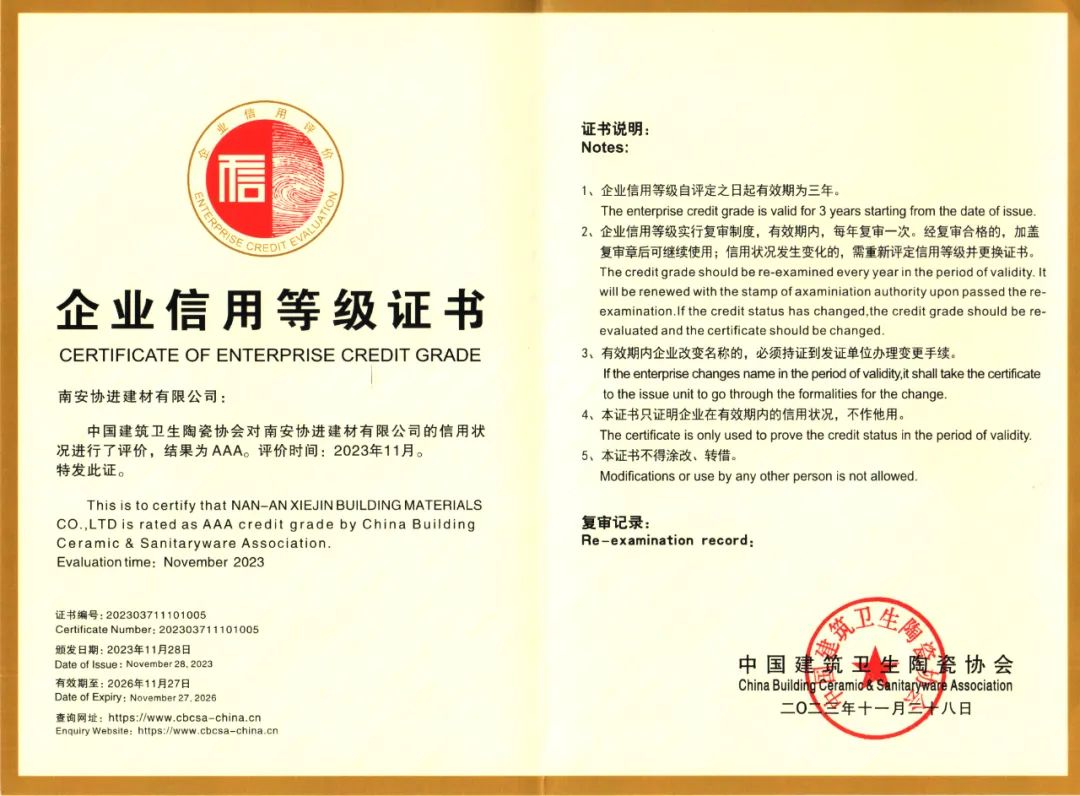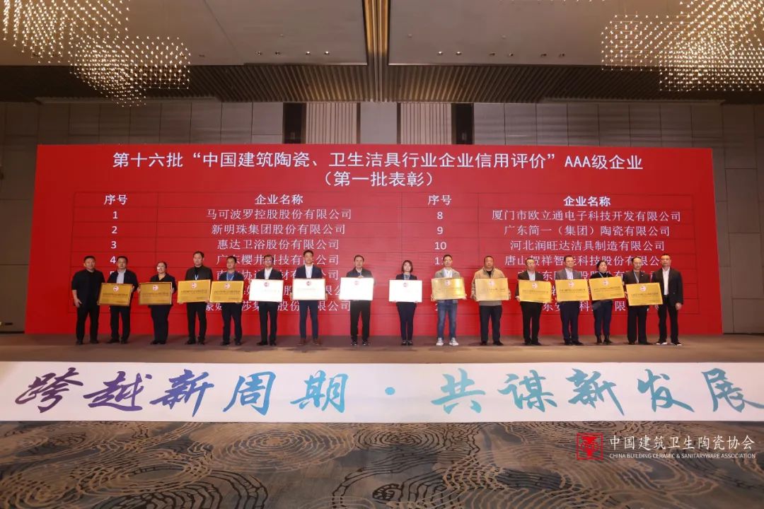 近日,中國(guó)建筑衛(wèi)生陶瓷協(xié)會(huì)2023年年會(huì)在南昌舉行。會(huì)上,為建陶行業(yè)第十六批誠(chéng)信企業(yè)授牌,南安協(xié)進(jìn)建材有限公司連續(xù)第六次獲評(píng)為中國(guó)建筑陶瓷與衛(wèi)生潔具行業(yè)AAA級(jí)信用企業(yè)。