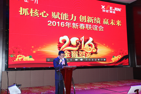 公司總經(jīng)理王少華在致辭中表示,2016年是關(guān)系企業(yè)生存的關(guān)鍵一年,希望全體協(xié)進(jìn)人和經(jīng)銷商能夠更進(jìn)一步發(fā)揚(yáng)“攜手創(chuàng)輝煌,創(chuàng)新求卓越”的協(xié)進(jìn)精神,精誠(chéng)團(tuán)結(jié)、齊心協(xié)力,確保企業(yè)渡過(guò)這一艱難時(shí)期。在這期間,一是牢牢抓住產(chǎn)品創(chuàng)新這個(gè)核心。通過(guò)加快對(duì)新產(chǎn)品的研發(fā)投入,促進(jìn)產(chǎn)品升級(jí)升值。比如公司最新研發(fā)的漢文化磚系列和小規(guī)格仿古磚系列新產(chǎn)品,就是為企業(yè)穩(wěn)健發(fā)展創(chuàng)造新的增長(zhǎng)動(dòng)力。二是賦予能力。通過(guò)持續(xù)的學(xué)習(xí)培訓(xùn),進(jìn)一步提高全體人員的經(jīng)營(yíng)管理能力、勞動(dòng)技能水平和營(yíng)銷業(yè)務(wù)技能。三是創(chuàng)新?tīng)I(yíng)銷模式。借用互聯(lián)網(wǎng)思維,開(kāi)創(chuàng)新一代的營(yíng)銷模式。2016年公司對(duì)營(yíng)銷體制進(jìn)行改革,讓更多有能力的員工在企業(yè)平臺(tái)上打拼一番新的事業(yè)。四是精細(xì)化生產(chǎn)管理。通過(guò)流程再造,有效控制成本,同時(shí)提高產(chǎn)品質(zhì)量。
